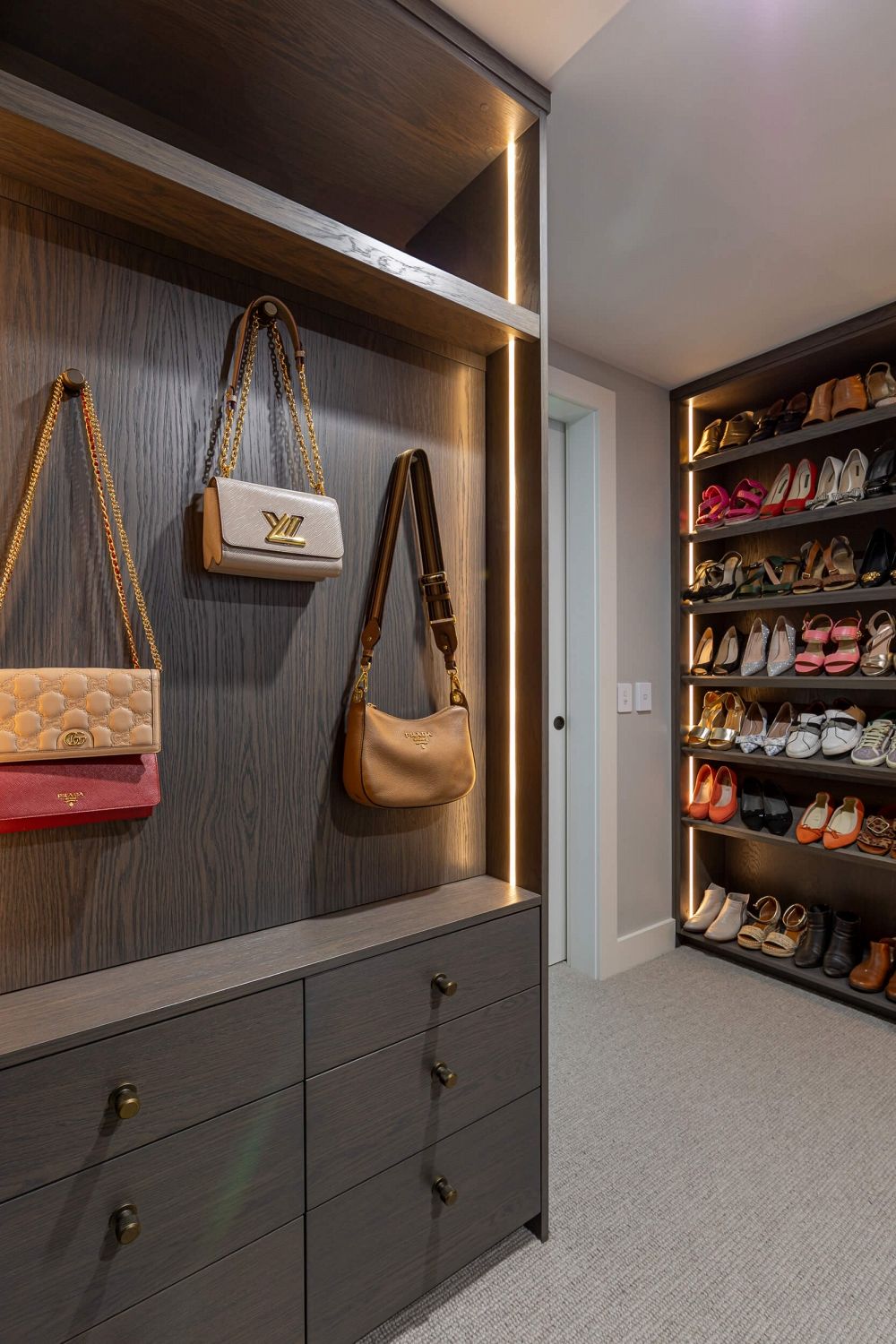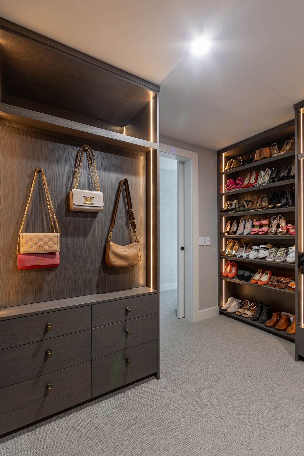 A key feature was the owner’s handbag collection. Rather than conceal it, we designed illuminated display zones framed by dark veneer panelling, allowing each piece to sit proudly within softly diffused LED lighting. The effect is both functional and gallery-like.
